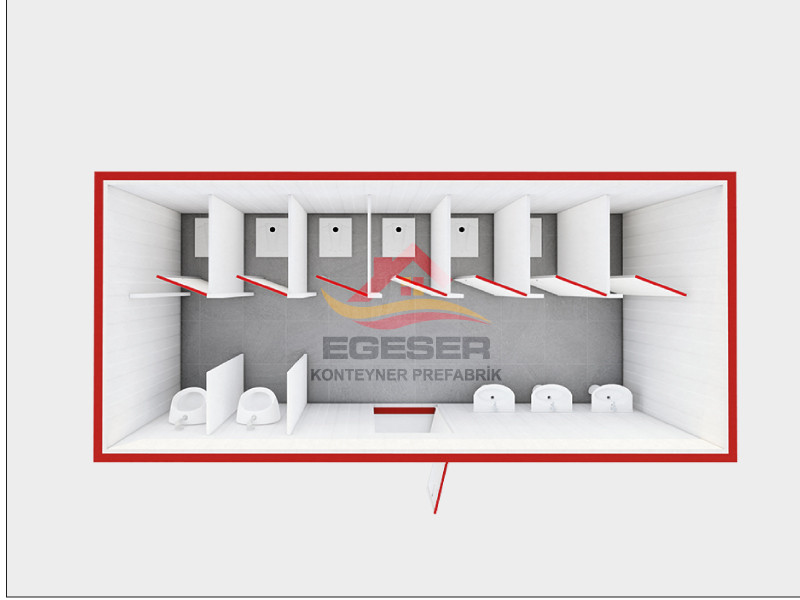 EGE-648 Konteyner Tuvalet Kabini, İzmir konteyner üreticisi Egeser Konteyner Prefabrik tarafından geliştirilmiş, 700×240 cm ölçülerinde çoklu tuvalet konteyner modelidir.